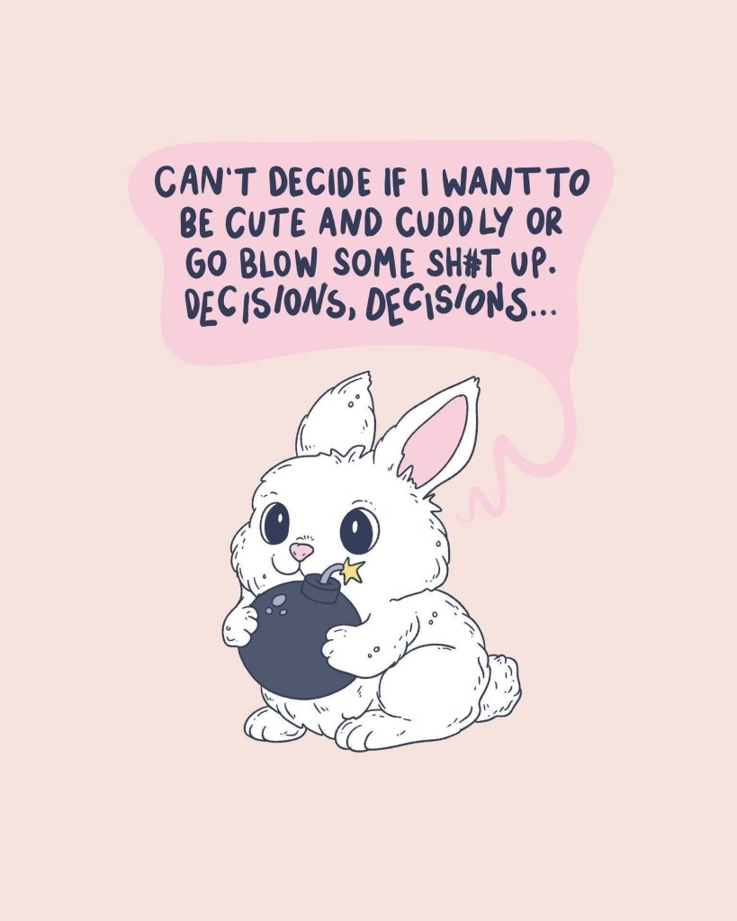 My therapist accidentally said I don’t need to be nice today. I don’t think she realizes how literal I can be and that if I’m not nice to someone my other option is to be a raging cuntwad. It’s truly not even on purpose but I have such bad people pleasing that I will fake an entire personality and kiss someone’s ass just to avoid any form of actual conflict.